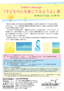 本展の「子どものこころを感じてみようよ」はシリーズ四作目の作品です。生まれてきた子どもたちは愛くるしい一方、大人の予想を超えた言動もあり、一筋縄ではいかないものです。「なぜ?」と戸惑い、怒り、哀しみと感情が高ぶることもしばしばではないでしょうか。小さい子どもは自分の考えをうまく伝える術をまだ知りません。子どもであることの自由さの一方で、大人を前にした時の無力感やもどかしさ…。そんな子どもの気持ちを感じ、「なぜ?」という疑問を少しでも緩和するお手伝いが出来れば幸いです。